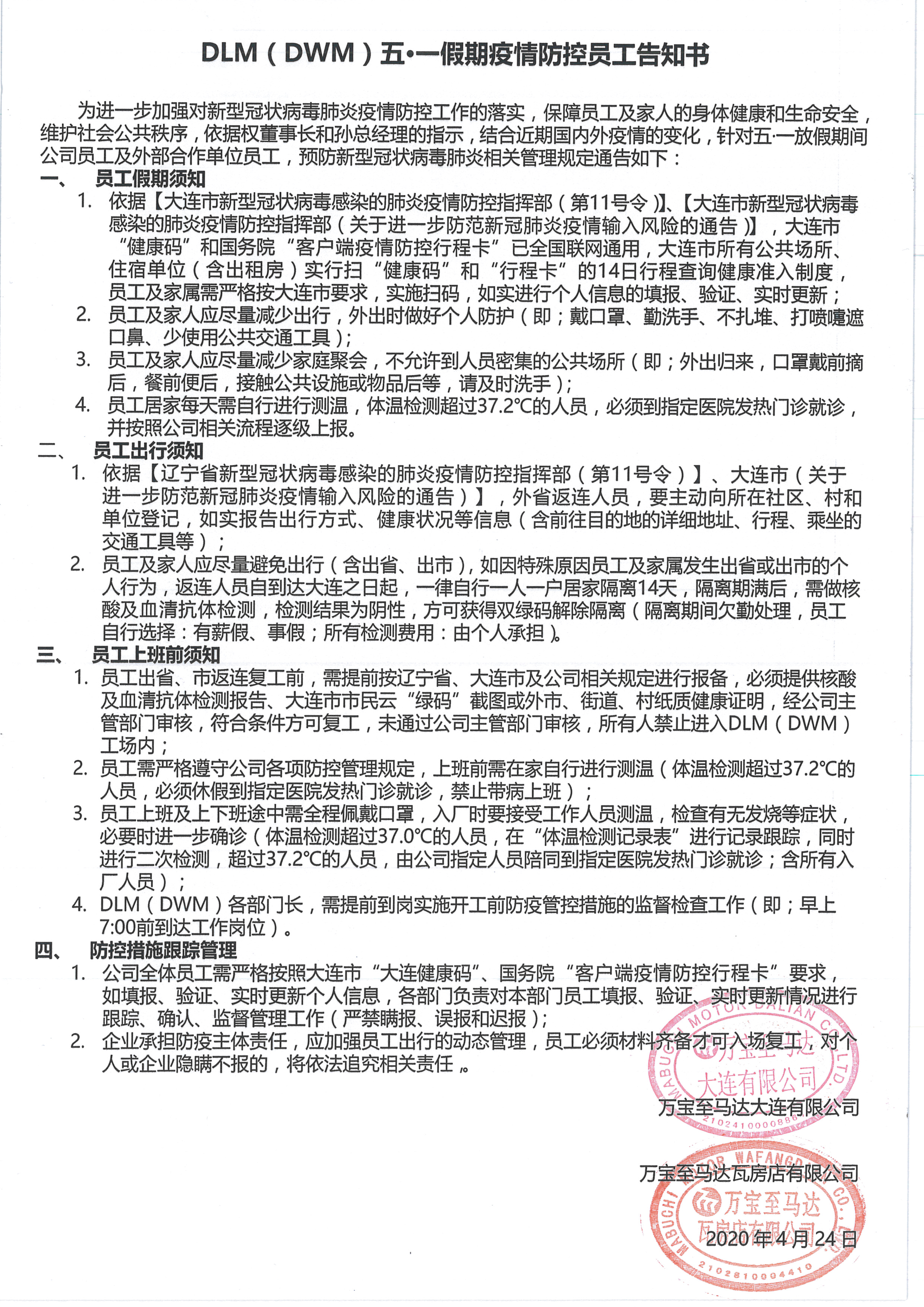 DLM(DWM)五·一假期疫情防控員工告知書(shū)